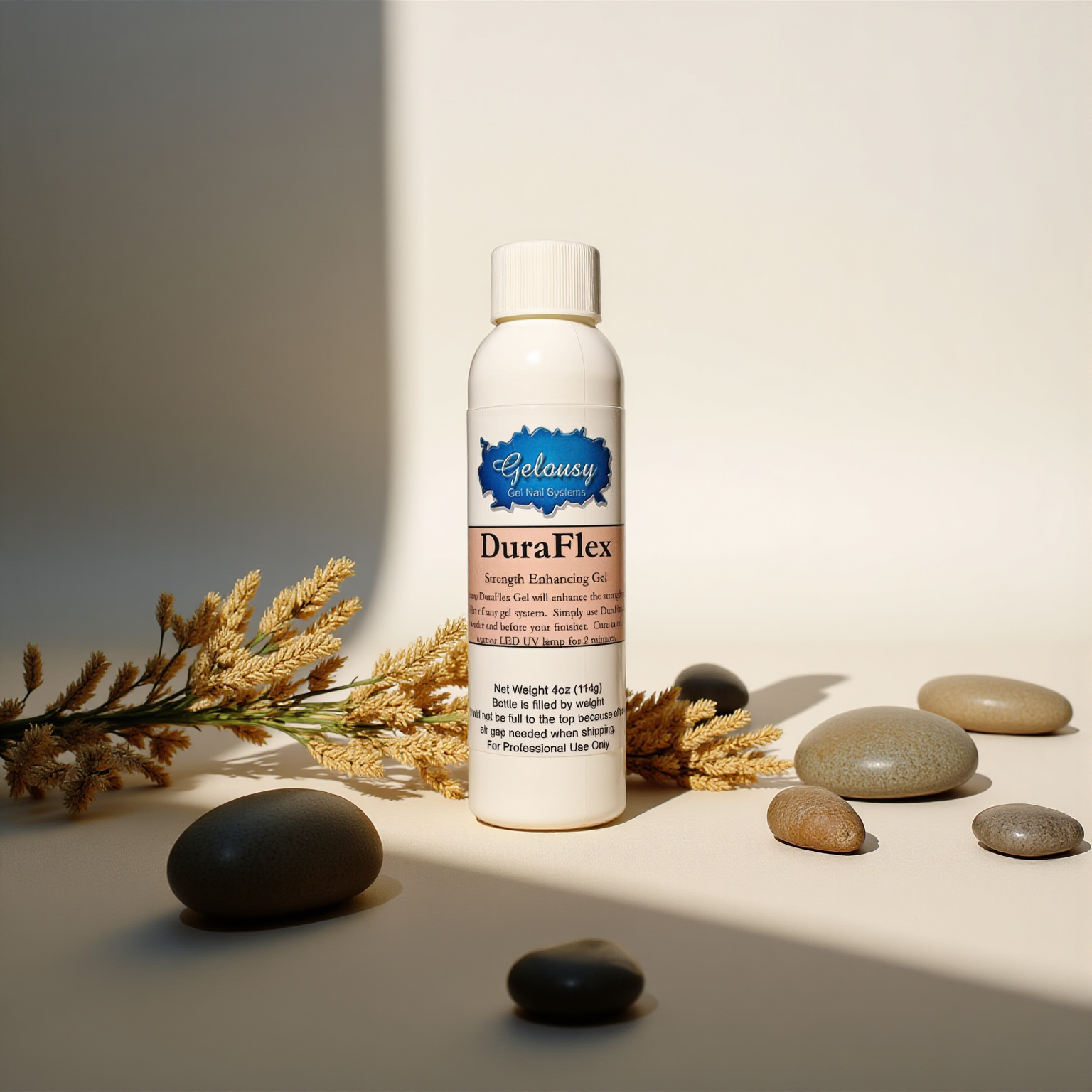 Gelousy Duraflex Gel will enhance the strength and flexibility of any gel system.  Simply use Duraflex after Gelousy Base Gel and before Gelousy Natural Gel.  Cure in a 36 watt or LED UV lamp for 2 minutes.